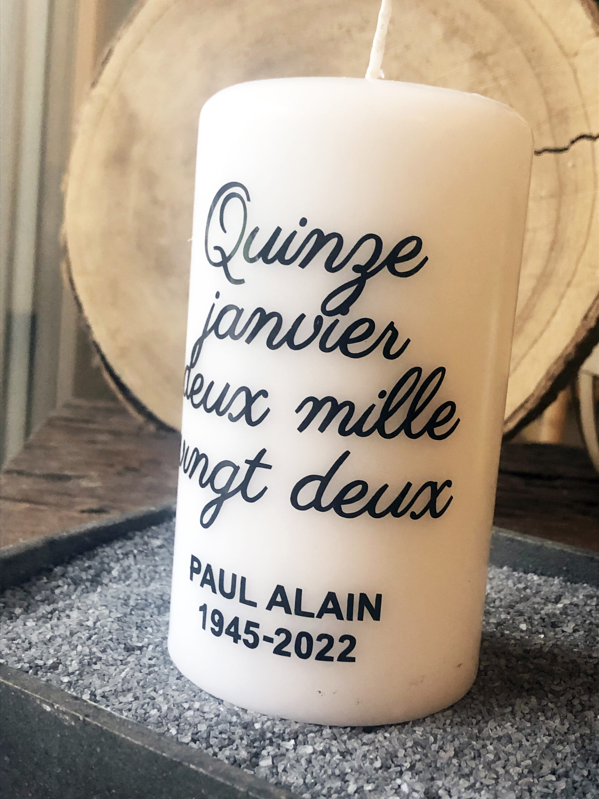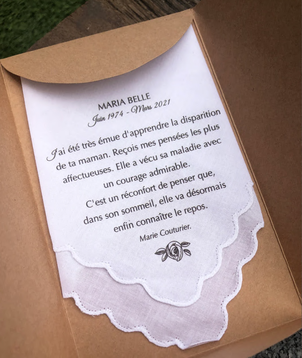 Laetitia a été en quelques sortes guidée vers ce métier. Elle a tout d’abord fait des études de graphisme. Après 16 ans de salariat, elle décide de changer de voie et se lancer dans l’entreprenariat évènementiel pour proposer des objets de décoration, tels que des bougies, des mouchoirs pour des mariages et des baptêmes. Elle se démarque grâce à son choix de matériaux, (bois, tissus) et ses idées originales. Malheureusement (ou bien heureusement !), l’arrivée du confinement a tout basculé. Son activité en a été impactée, tout était en pause. Au même moment…elle a perdu son papa suite à une longue maladie. Sa famille et ses proches l’ont entourés jusqu’à son dernier souffle et ont pu lui dire un dernier au revoir à domicile. Viennent ensuite les préparatifs pour les funérailles de son papa. Elle se rendu compte d’une chose : les différents articles proposés dans le monde du funéraire ne sont pas assez chaleureux, personnalisés et modernes. Elle a voulu « rafraichir » ce secteur en se spécialisant dans le souvenir funéraire. Aujourd’hui elle propose des éléments tels que les galets funéraires, les mouchoirs personnalisés, les bougies et les cartes de remerciements.